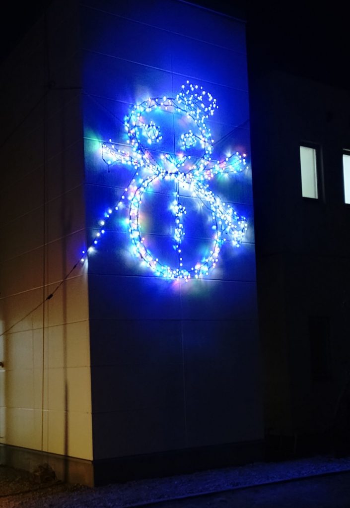 今年のイルミネーションは、エレベーターの外壁に点きました